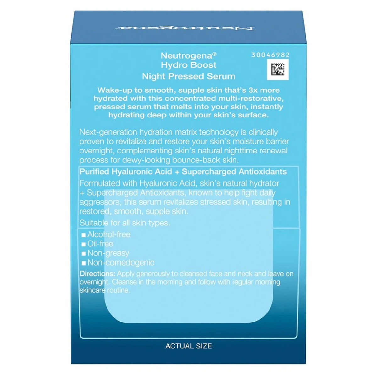 Wake up to smooth, supple skin that’s three times more hydrated with Neutrogena Hydro Boost Hyaluronic Acid Night Pressed Serum. From a dermatologist-recommended brand and suitable for all skin types, the concentrated pressed serum is clinically proven to revitalize and restore your skin’s moisture barrier overnight. The multi-restorative formula melts into skin to intensely hydrate deep within the surface. Formulated with purified hyaluronic acid and supercharged antioxidants that are known to help fight daily aggressors, this smoothing night serum complements skin’s natural nighttime renewal process. The non-greasy serum is oil-free, alcohol-free, and non-comedogenic, which means it won’t clog pores or cause breakouts. To use, apply the hydrating serum generously to face and neck and leave on overnight. For best results, use Neutrogena Hydro Boost Night Pressed Serum as part of a hydrating at-home skincare routine. Use at night after cleansing with Hydro Boost Hydrating Cleanser.